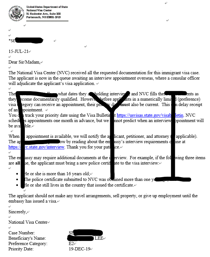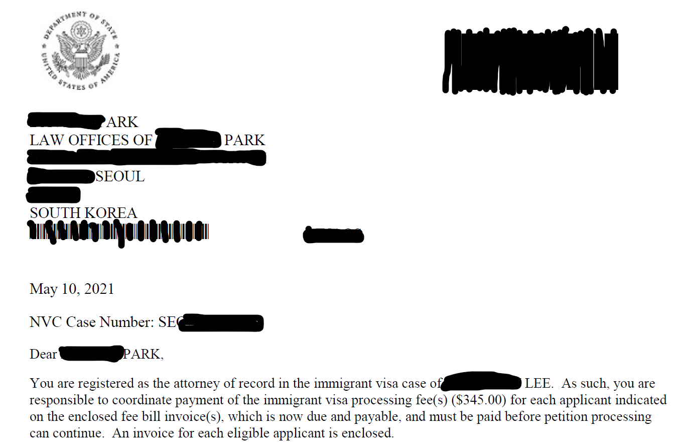 Packet 3라고 하는데, DS-260이 승인되었다는 레터를 받은 상황을 말합니다. 이제 여기까지 왔다면 8부능선을 넘었다고 할 수 있습니다. 이민국과 커뮤니케이션 해야할 모든 절차는 끝났고, 서류가 대사관으로 넘어가 인터뷰가 잡히기만을 기다리면 됩니다. 인터뷰가 잡히기까지는 보통 예전에는 3개월내외가 걸린다고했는데, 코로나로 인하여 적체가 발생해, 현재는 1년정도의 시간이 소요되는 상황입니다. (요즘은 또 분위기가 어떤지 모르겠네요.)