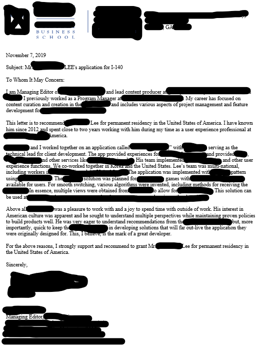 그리고, 마지막으로 중요한 것이 2건 이상의 추천서입니다. 자신과 같이 일해본 미국시민권을 가진 사람의 추천이 있다면 가장 큰 플러스 점수를 받을 수 있습니다. 같은 분야라면 더 좋을 것입니다.