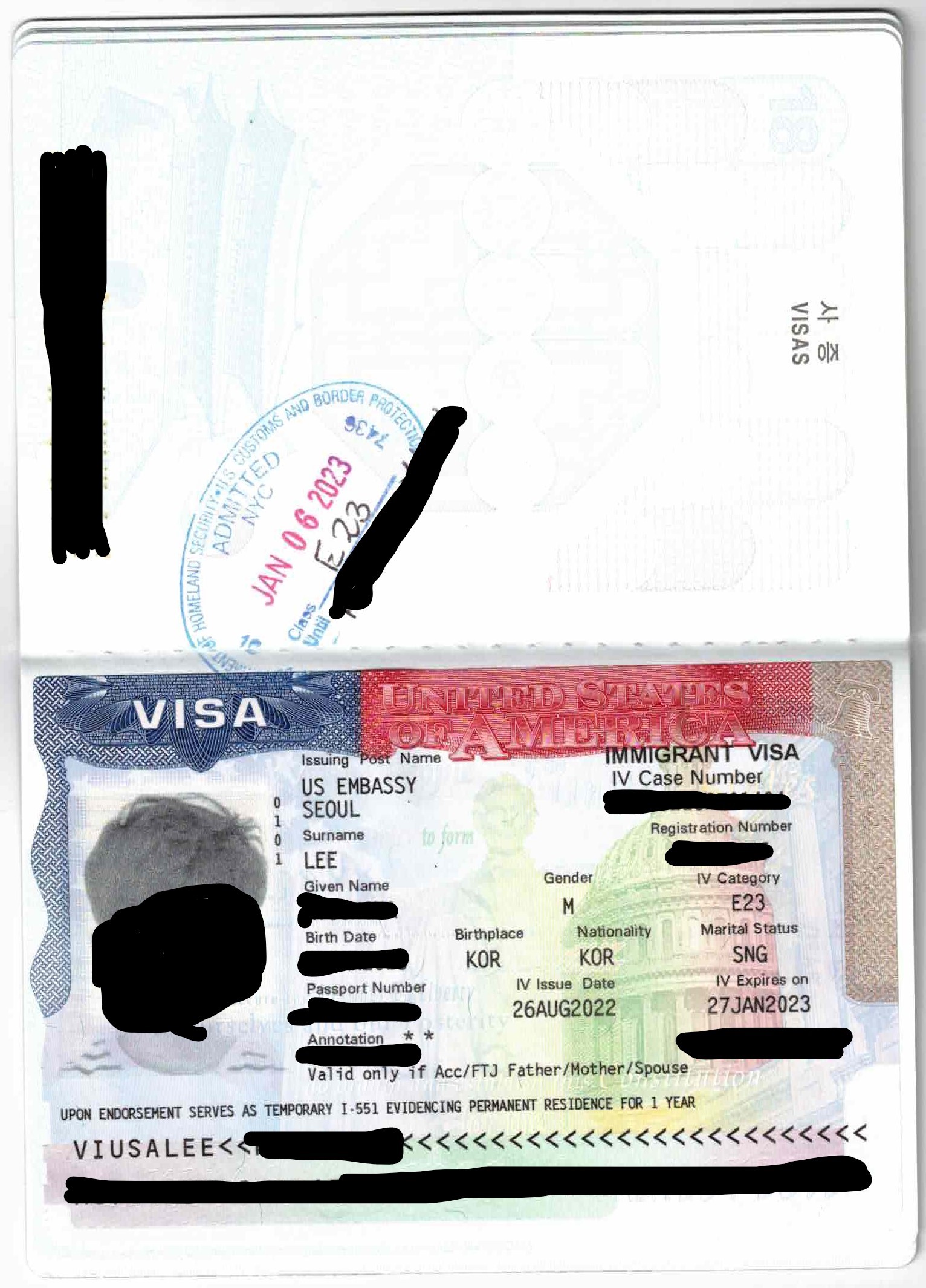 이 비자를 들고, 미국입국을 했을 때, 이 비자위에 입국도장이 찍히는 순간, 신분이 영주권자로 바뀌게 되고,