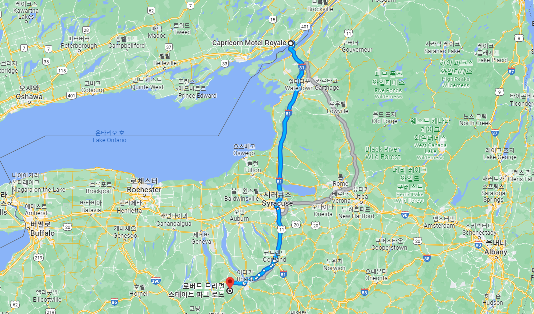 캐나다 Ivy Lea근처의 숙소를 출발해서 미국으로 넘어왔습니다. 3시간 30분정도 걸리는 거리인데, 중간에 미국출입국관리소를 지나면서 30분정도 시간이 더 걸렸습니다.