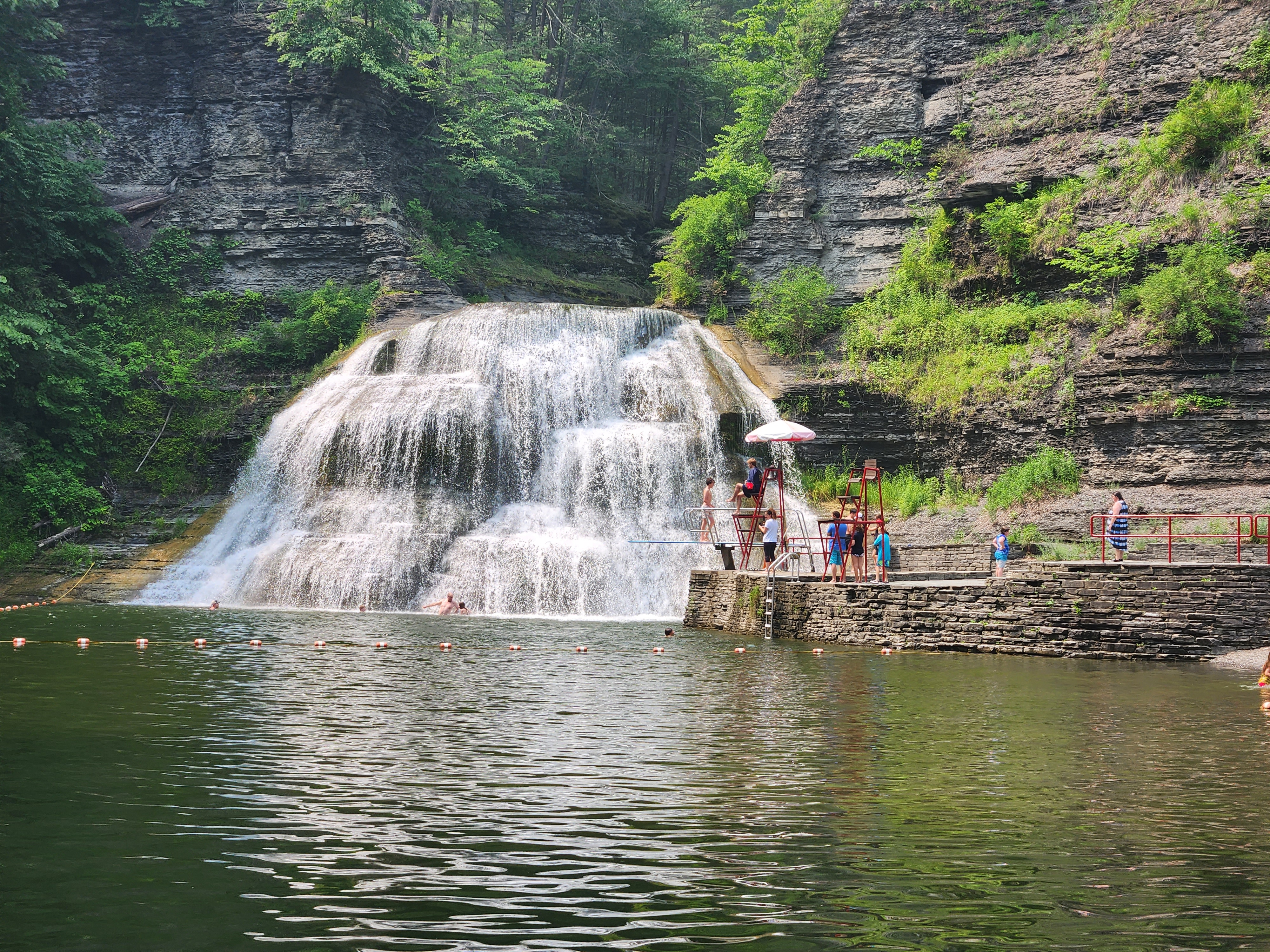 주차장에서 많은 아이들이 수용복 차림으로 왔다갔다합니다. 도보로 들어가보니 폭포(Lower falls)와 함께 하는 자연풀장이 있습니다.